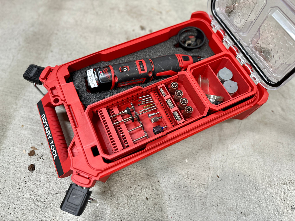 Στο εσωτερικό θα βρείτε ειδικά σχεδιασμένες βάσεις για μια σειρά από bits Dremel, καθώς και βάσεις για δίσκους μεγέθους 21mm, 25mm, 33mm και 39mm που χωρούν δίσκους κοπής 1,5". Υπάρχουν επίσης ειδικές βάσεις για τύμπανα λείανσης, διασφαλίζοντας ότι όλα τα μικρά σας μέρη έχουν μια σταθερή θέση. Το σετ περιλαμβάνει επίσης έναν στοιβαζόμενο δίσκο και ένα κάτω κύπελλο με προαιρετικά διαχωριστικά για το ψηλό δοχείο που περιλαμβάνεται στο σύστημα Packout. Αυτό παρέχει ευελιξία για τη διαίρεση του χώρου σύμφωνα με τις συγκεκριμένες ανάγκες σας.