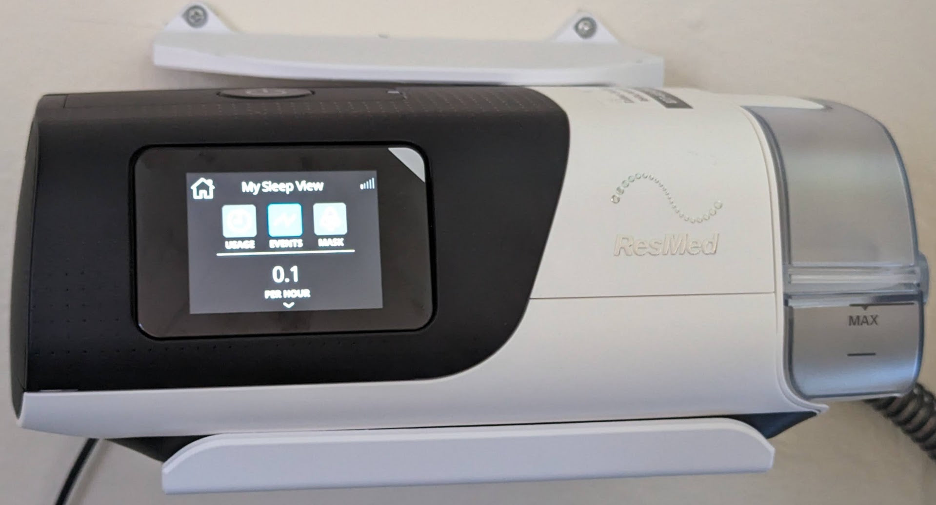 Ένα πλεονέκτημα αυτής της βάσης τοίχου είναι ο προσεγμένος σχεδιασμός του που επιτρέπει την ευέλικτη δρομολόγηση τόσο του καλωδίου τροφοδοσίας όσο και του σωλήνα είτε προς τα αριστερά είτε προς τα δεξιά, ανάλογα με τη διάταξή σας. Επιπλέον, όλες οι σημαντικές λειτουργίες της συσκευής CPAP AirSense 11 σας παραμένουν εύκολα προσβάσιμες. Μπορείτε να αλλάζετε το φίλτρο αέρα χωρίς δυσκολία, να χειρίζεστε τα κουμπιά στο επάνω μέρος και να διαβάζετε εύκολα την μπροστινή οθόνη, διασφαλίζοντας ότι η θεραπεία σας παραμένει απρόσκοπτη και αποτελεσματική.