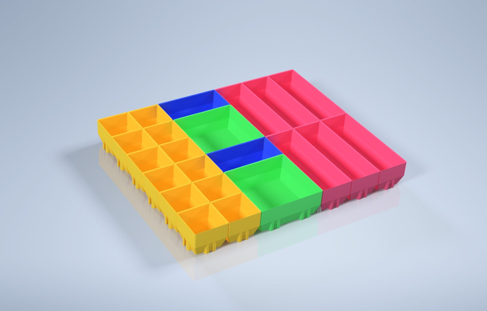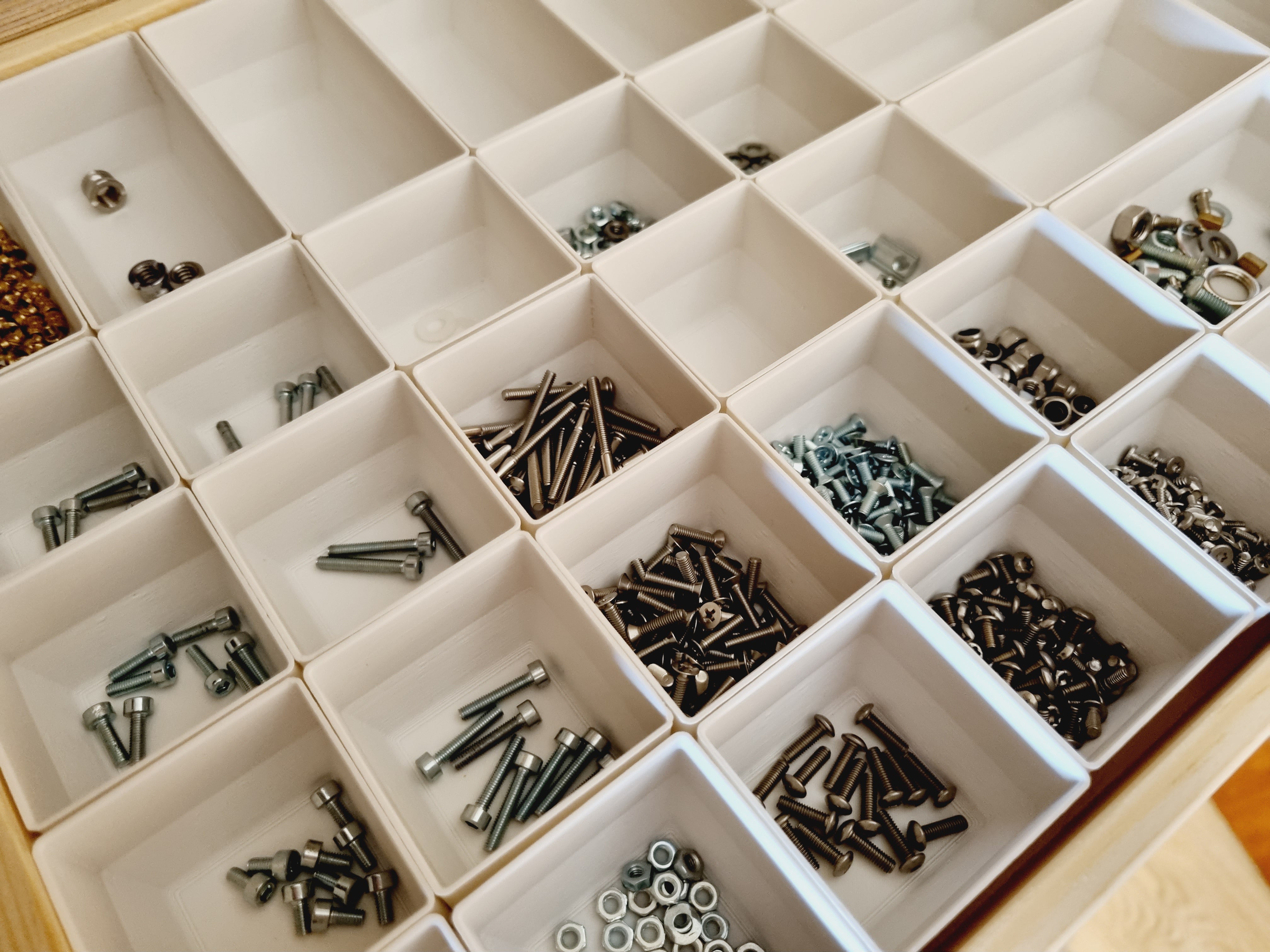 Αυτό το δοχείο/συρτάρι για μικρά εξαρτήματα έχει σχεδιαστεί για να οργανώνει το συρτάρι με τις βίδες και τα παξιμάδια. Το μικρότερο είναι 45mm x 45mm και τα άλλα ακολουθούν τα πολλαπλάσια αυτού: 2x1, 2x2 και 3x1. Μπορούν να συνδεθούν με έναν μικρό σύνδεσμο.