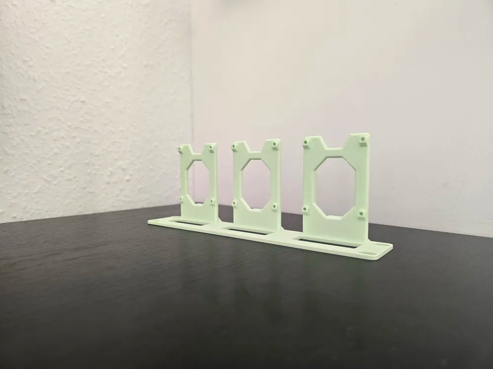 Dette beslag muliggør montering af tre Raspberry Pi 5 enheder i et 10-tommer rack kabinet. Løsningen er ideel til organisering af homelab udstyr og sikrer en ryddelig opsætning. Designet understøtter valg mellem 3 mm og 4 mm frontpaneler og anvender M2.6 skruer til sikker fastgørelse af enhederne.
