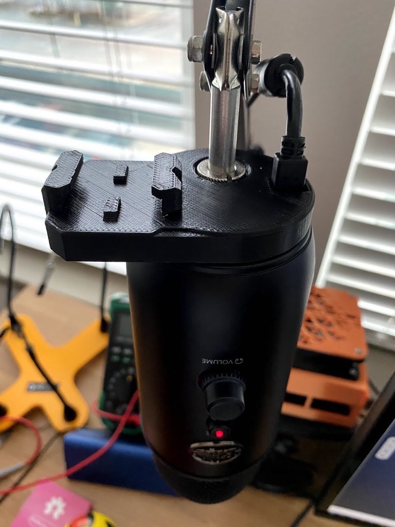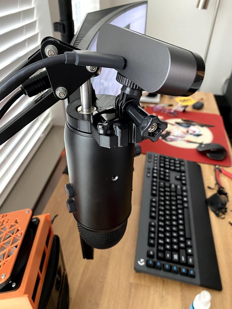 Αυτό είναι ένα στήριγμα για το μικρόφωνο Blue Yeti που επιτρέπει την τοποθέτηση μιας GoPro ή μιας κάμερας web πάνω (ή στην πραγματικότητα κάτω) από το μικρόφωνο. Ιδανική λύση για όσους έχουν μια κάθετη, στοιβαγμένη εγκατάσταση οθόνης, καθώς διατηρεί την κάμερα σε υπερυψωμένη θέση και με κατεύθυνση προς το χρήστη από το πλάι.