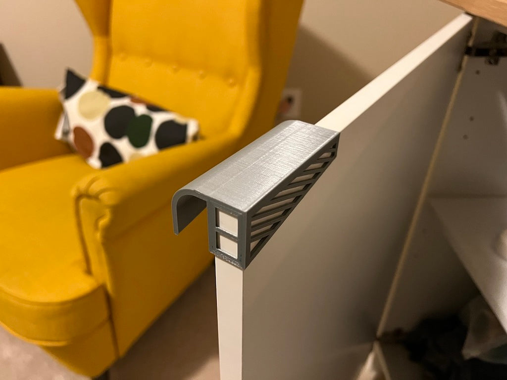 Αυτό το προϊόν είναι μια λαβή ντουλαπιού, σχεδιασμένη να ταιριάζει στις πόρτες ντουλαπιών Ikea KNOXHULT που έχουν πάχος 16,4 mm. Οι λαβές δεν χρειάζονται τρύπημα ή οπές, καθώς έχουν σχεδιαστεί για να εφαρμόζουν σφιχτά στην πόρτα του ντουλαπιού μέσω τριβής. Εάν θέλετε πιο σφιχτή εφαρμογή, μπορείτε να εφαρμόσετε ταινία διπλής όψης ή να τοποθετήσετε ένα κομμάτι χοντρό χαρτί. Μπορείτε να "ανταλλάξετε" την πλευρά και να τις χρησιμοποιήσετε κάθετα αντί για οριζόντια.