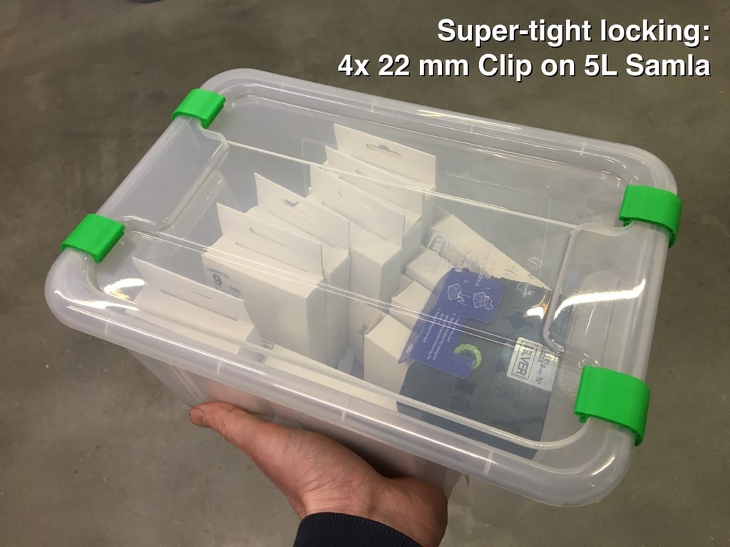 Αυτό είναι ένα αυτοκατασκευασμένο κλιπ για τις δημοφιλείς κασέτες Samla από την IKEA. Κατασκευασμένο με γνώμονα τη δύναμη και την αντοχή ως την κύρια προτεραιότητα, αυτό το κλιπ ικανοποιεί όλες τις ανάγκες αποθήκευσης, είτε πρόκειται για κουτιά 5-, 11-, 22-, 45- ή 65 λίτρων. Ιδανικό για όσους χρειάζονται μια πιο αποτελεσματική λύση σύσφιξης για τα κουτιά Samla.