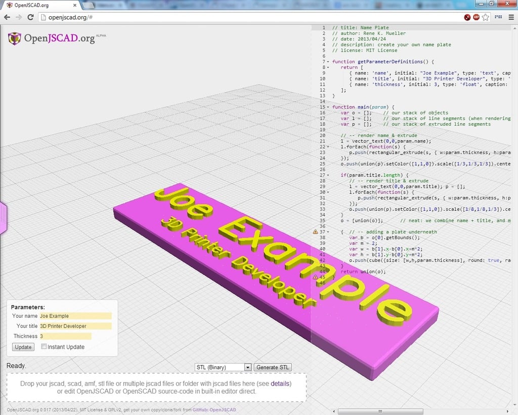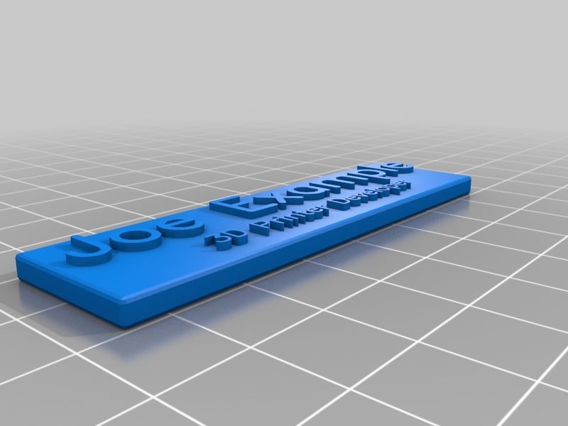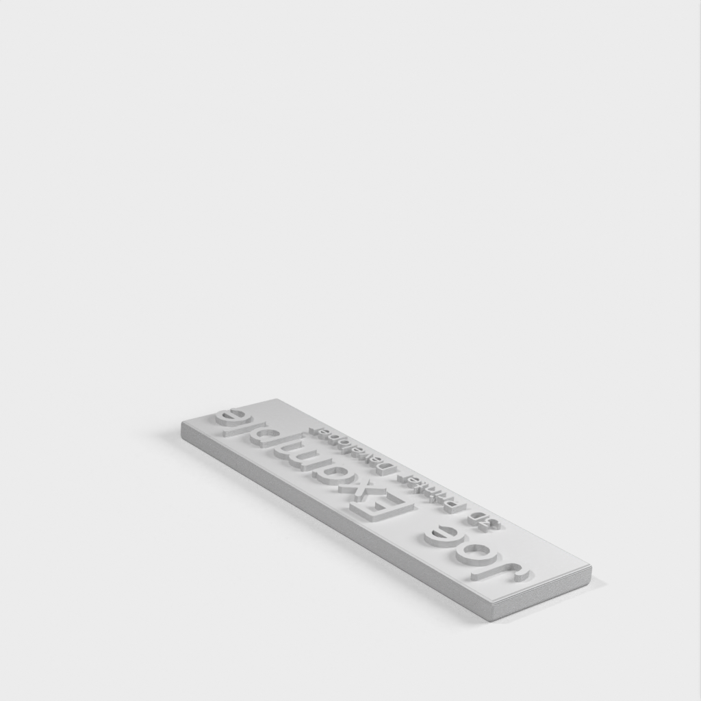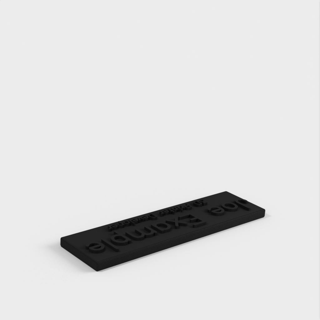 Γεννήτρια πινακίδων ονομάτων από το OpenJSCAD που σας επιτρέπει να εισάγετε το όνομα και τον τίτλο σας και θα δημιουργήσει μια προσαρμοσμένη πινακίδα ονομάτων για εκτύπωση. Το τελικό αρχείο STL ή AMF μπορεί εύκολα να εξαχθεί στον εκτυπωτή σας.