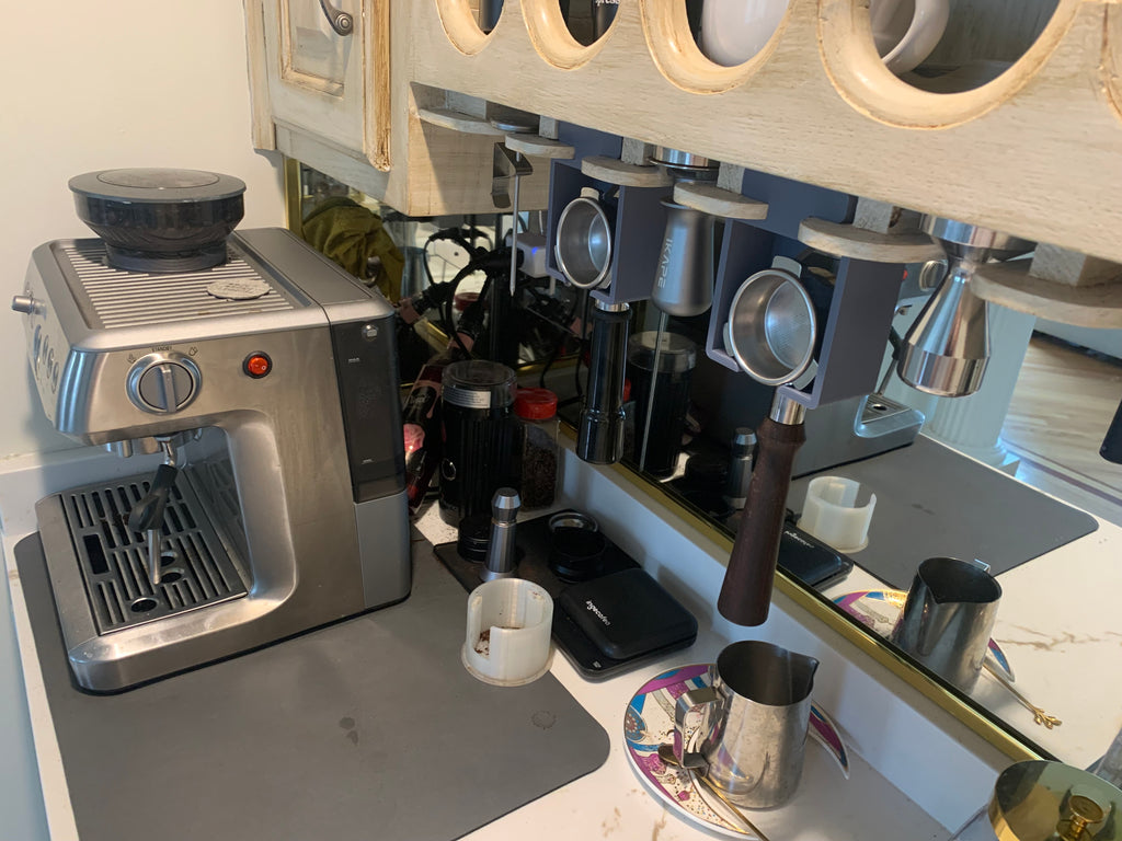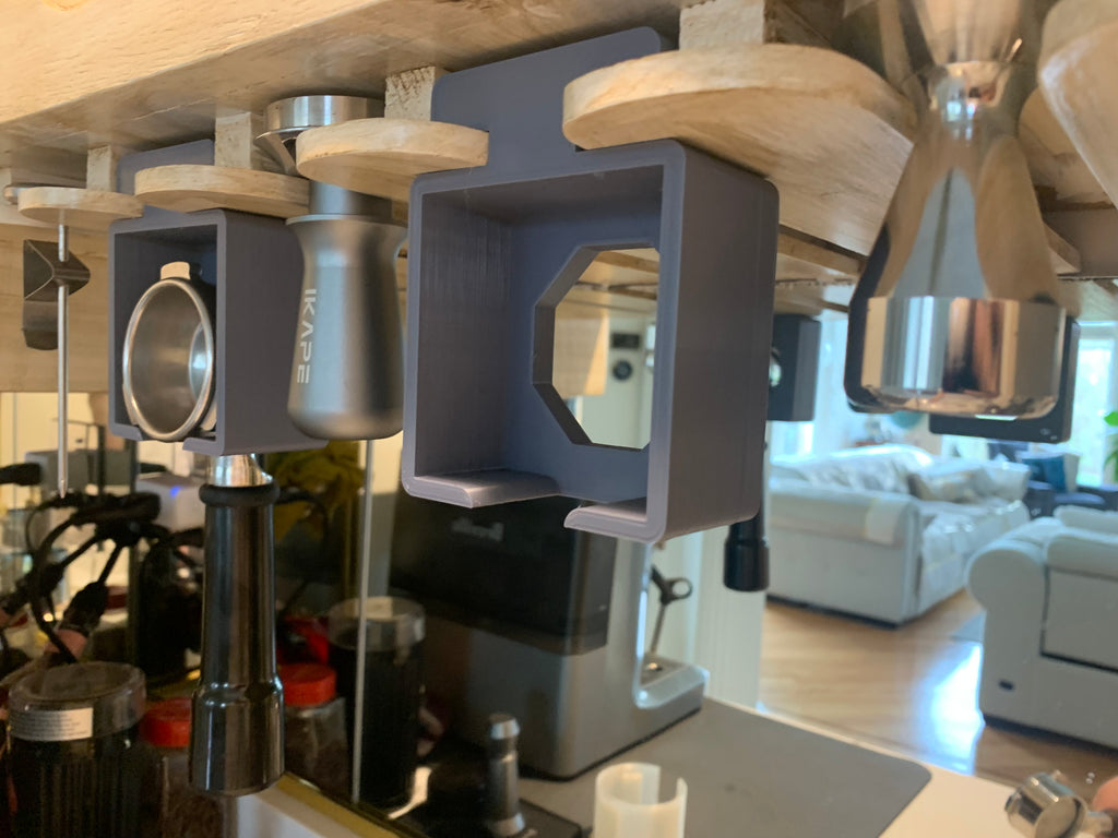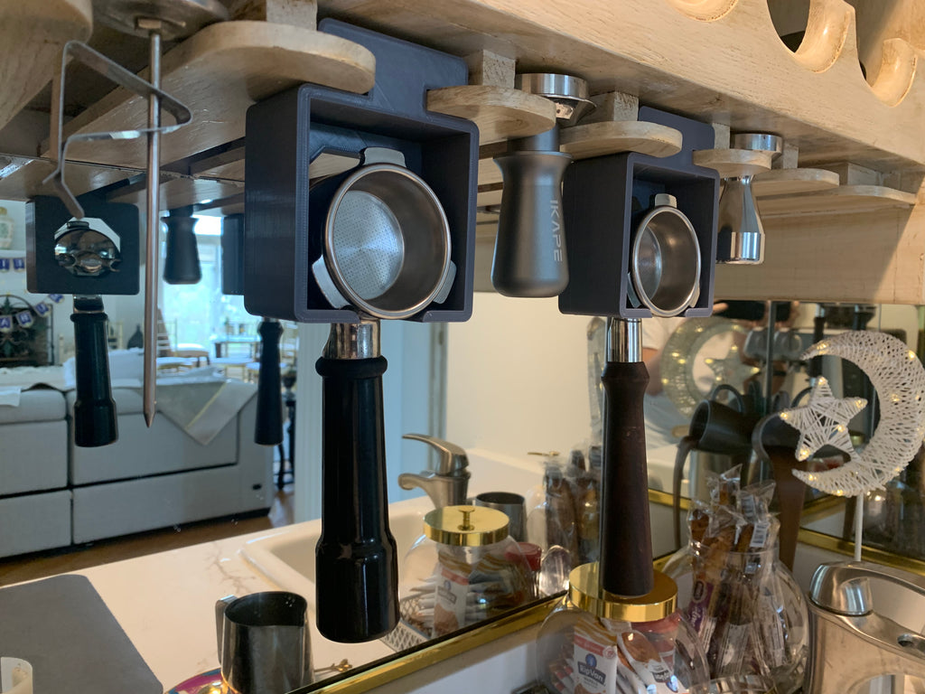Για τους λάτρεις του καφέ που εκτιμούν τόσο τη λειτουργικότητα όσο και μια τακτοποιημένη κουζίνα, αυτή η έξυπνη θήκη portafilter προσφέρει μια ιδανική λύση. Σχεδιασμένο για να αξιοποιεί τον συχνά παραβλεπόμενο χώρο κάτω από το ντουλάπι της κουζίνας σας, όπου είναι ήδη εγκατεστημένη μια βάση για ποτήρια κρασιού, μετατρέπει τον αχρησιμοποίητο χώρο σε πρακτική αποθήκευση του portafilter σας.