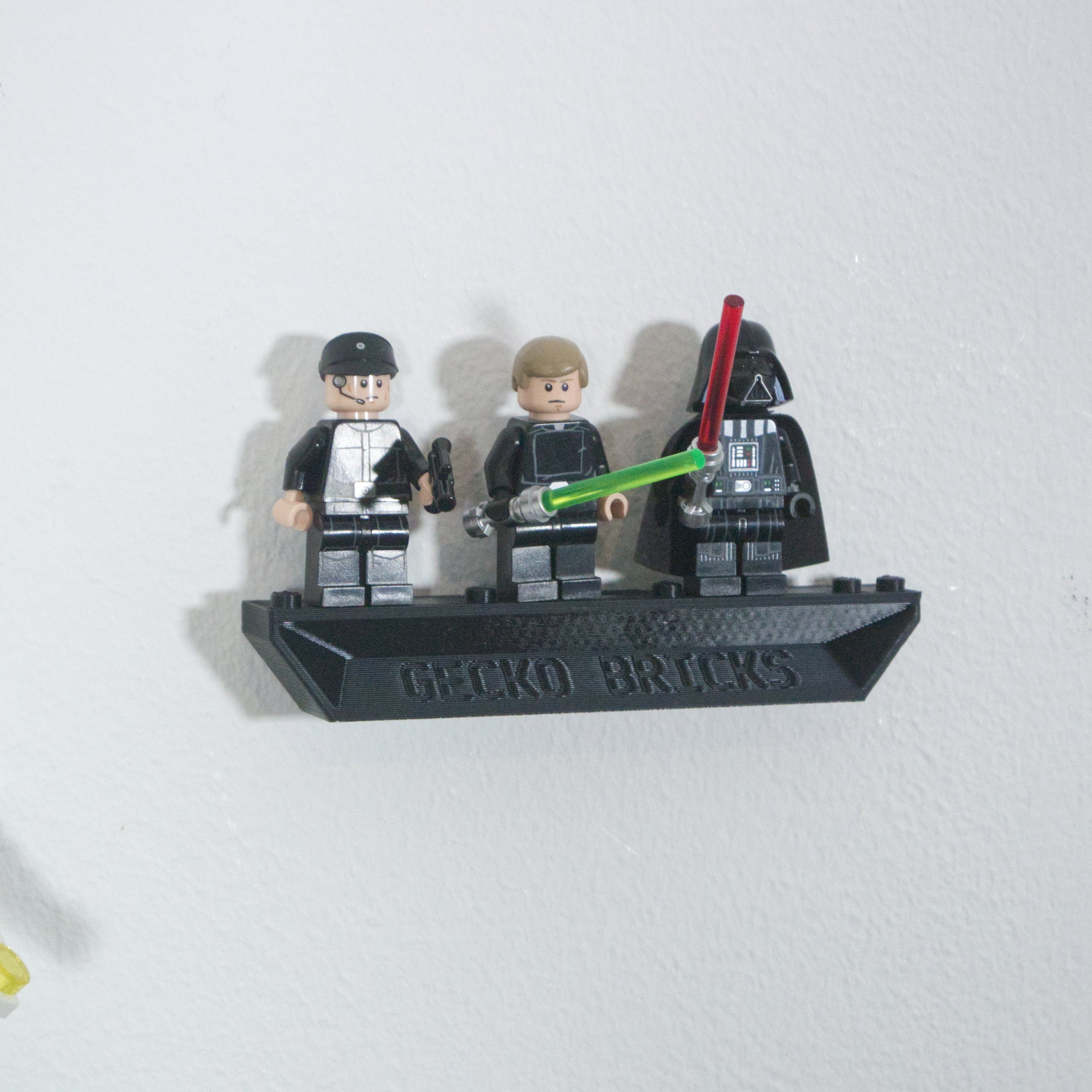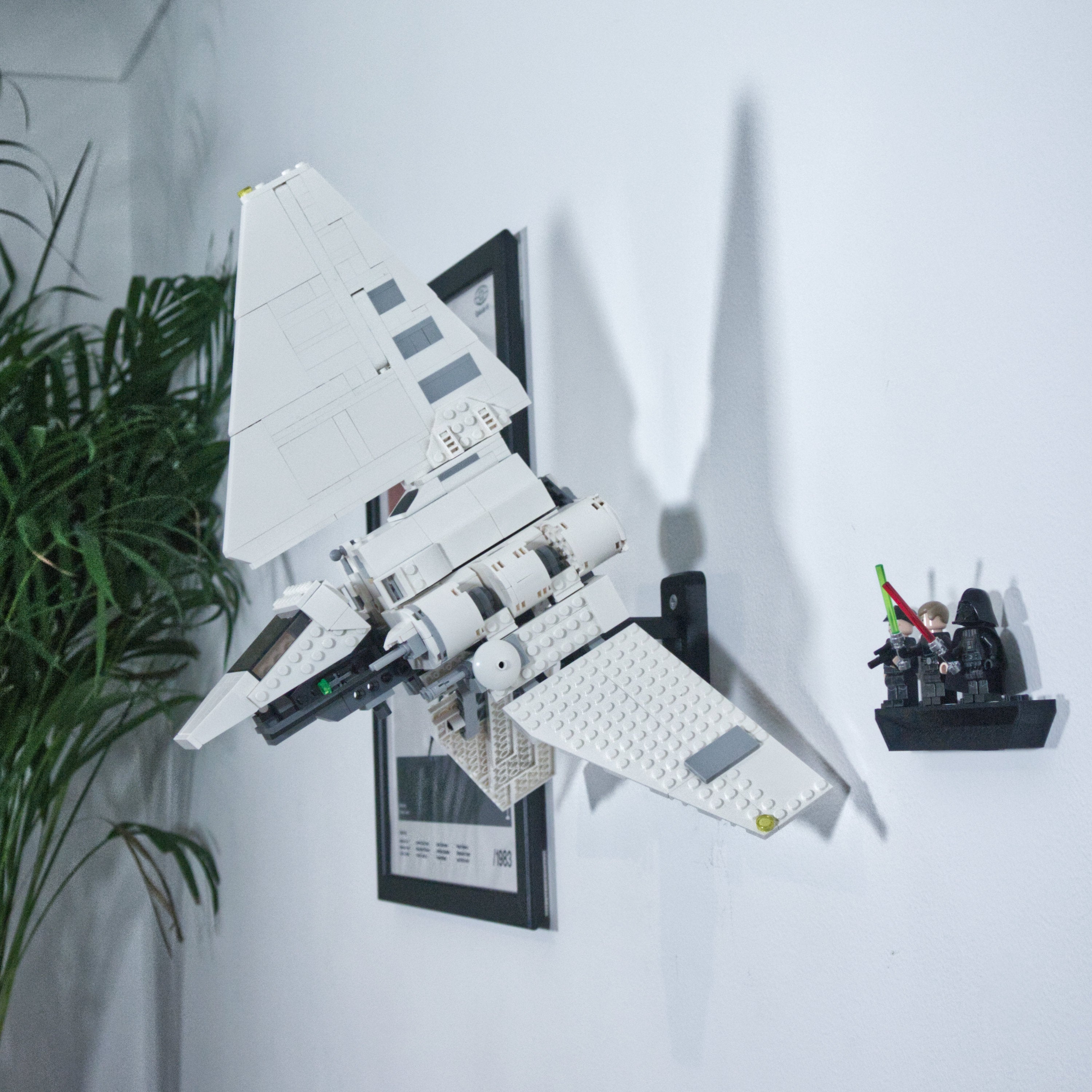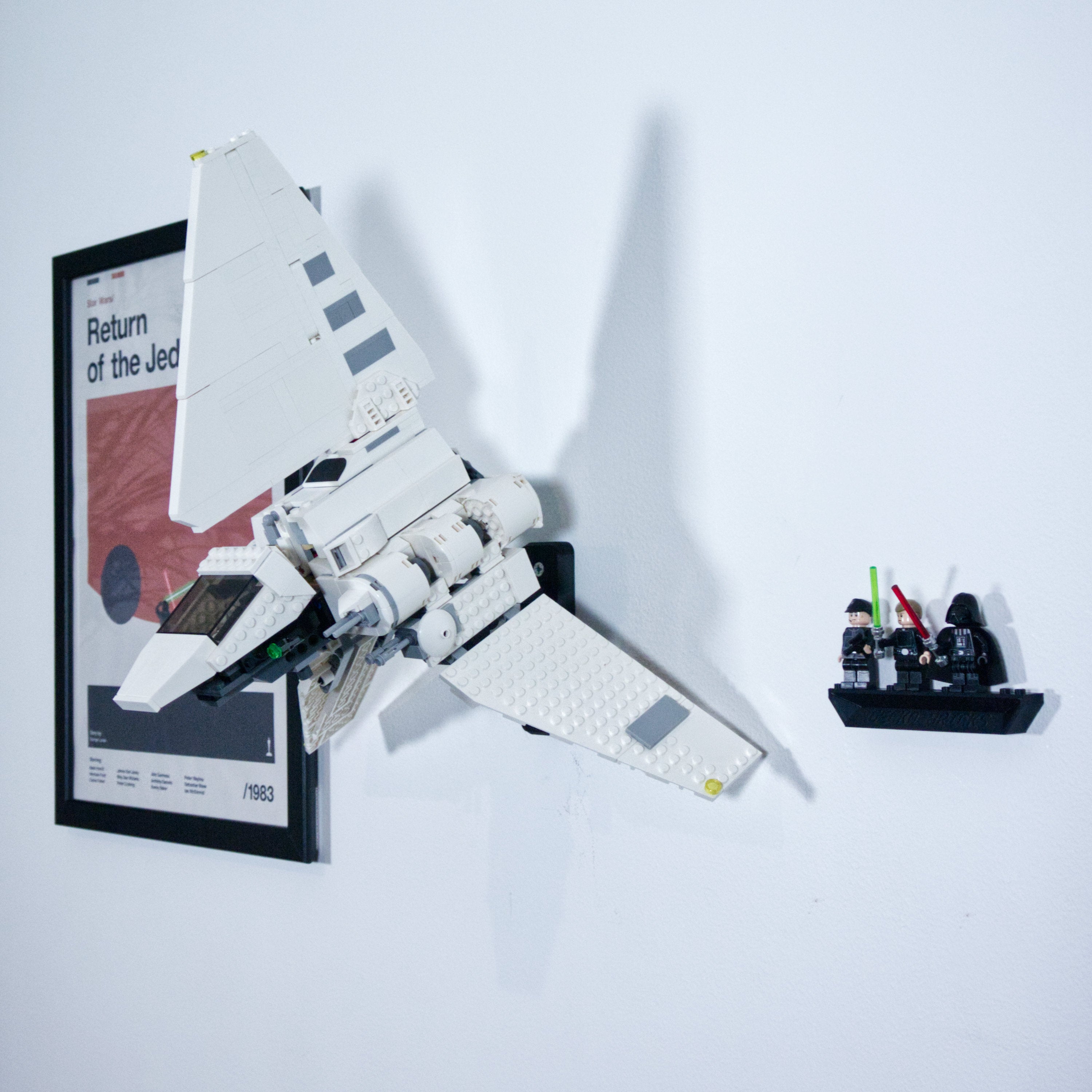 Αυτή η βάση στήριξης τοίχου παρουσιάζει το Imperial Shuttle σας προς τα εμπρός, τονίζοντας το σχήμα της πτέρυγας του μοντέλου. Η βάση προσφέρει ρυθμιζόμενη γωνία για βέλτιστη προβολή και διευκολύνει την αφαίρεση του σετ όταν χρειάζεται. Περιλαμβάνεται ξεχωριστή βάση για μίνι φιγούρες, ώστε ολόκληρη η συλλογή να μπορεί να εκτίθεται μαζί στον τοίχο.